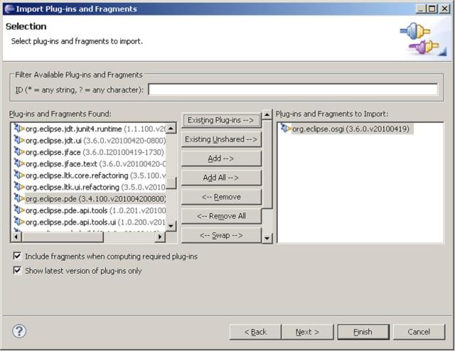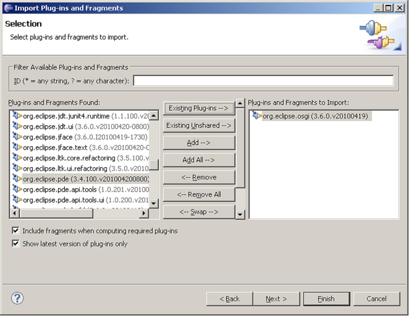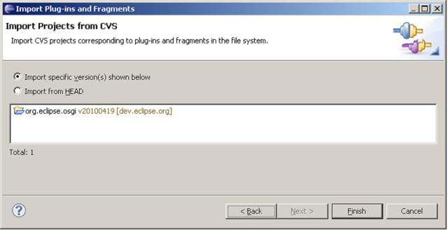 You’ll be prompted for a connection to use and then voila! Version 20100419 of org.eclipse.osgi will appear in your workspace.