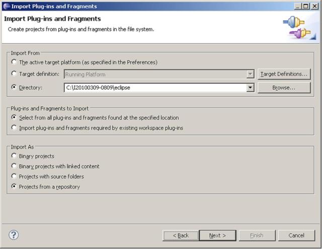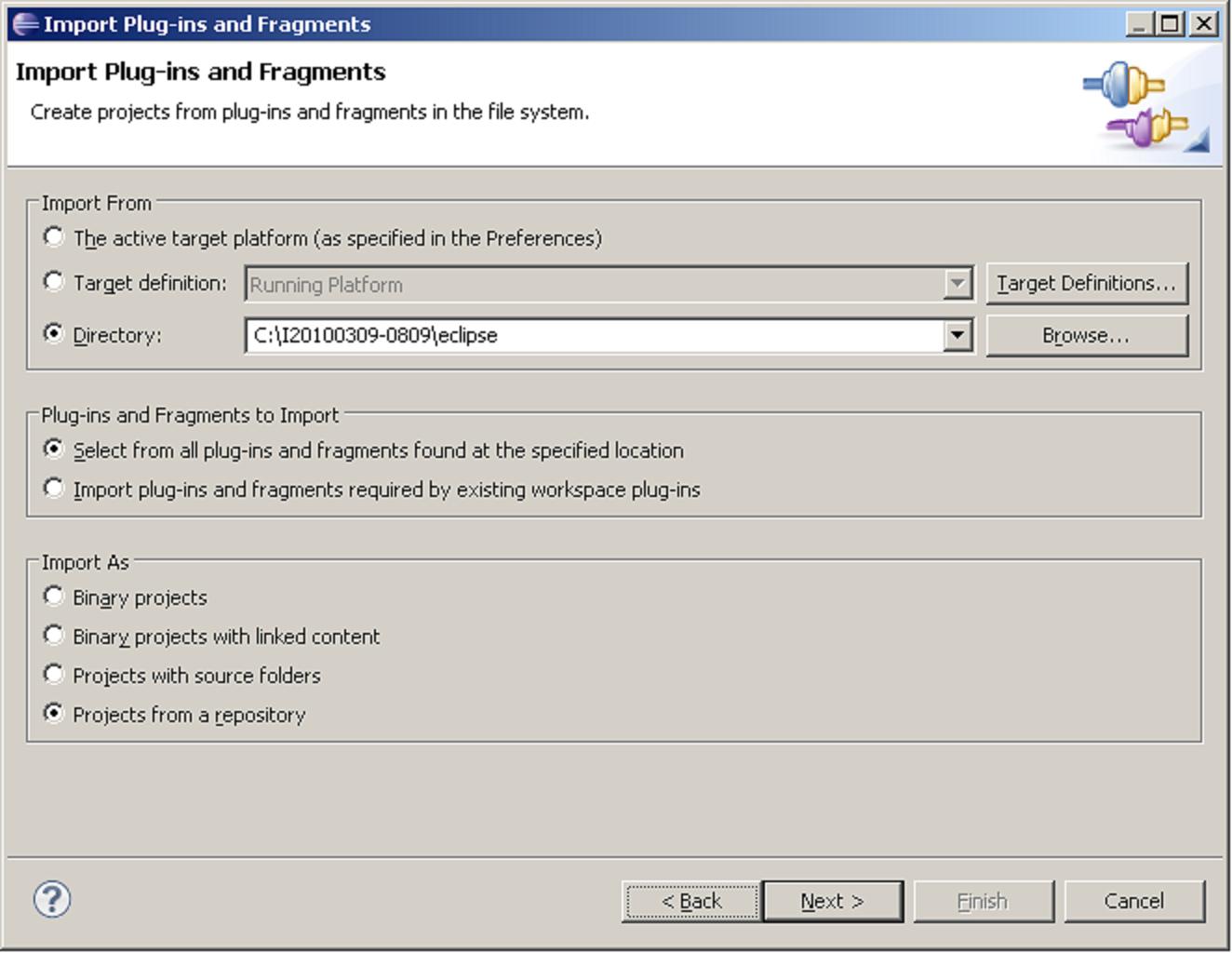 You’ll be prompted if you want to import the version specified in the manifest or from HEAD. Since the bundles we are using are from an integration build and have the version specified, we’ll use the v20100419 version.