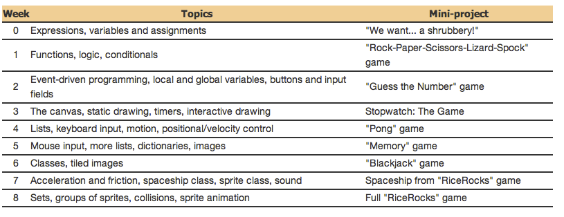 The best course I’ve taken so far has been the nine week Interactive Programming in Python class offered by Coursera. Coursera is a company that offers university courses for free.  You receive a grade and certification of completion,  but not an actual credit at the institution. The Python course I took is in conjunction with Rice University.  For this course, you have to register for the course when it’s run and complete the work each week.   There are an hour or so of video lectures, a quiz or two and an assignment to complete for around 8-10 hours of work each week.  After you submit your assignment, you’re asked to review the work of five other students.  This is how to scale marking assignments for the thousands of students enrolled in the class :-).  The code for your assignments is written in the browser,  on the CodeSkulptor website.