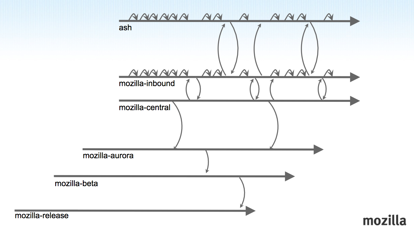 Merge day, which occurs every six weeks is when changes are uplifted to the next stable branch. Here’s a picture from a talk John O’Duinn gave last year that shows an example of how changes move between branches1.