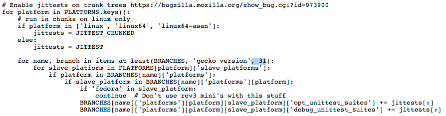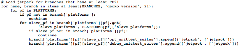 For the release engineering team, each merge day we would update code in our buildbot configs to reflect changes that needed to be made after uplift. For instance, we often deprecate platforms or add new tests that only apply to certain branches. We used to have to to specify the branches that these applied to in our configs and update them every merge day. It was tricky to get this right. Last fall, Steve Fink fixed a bug that would allow us to base config versions on the version of gecko that rides the trains. So each merge do we update the version of gecko in our configs on a per branch basis, and then have code like this so that the tests are only enabled for branches where the gecko version applies