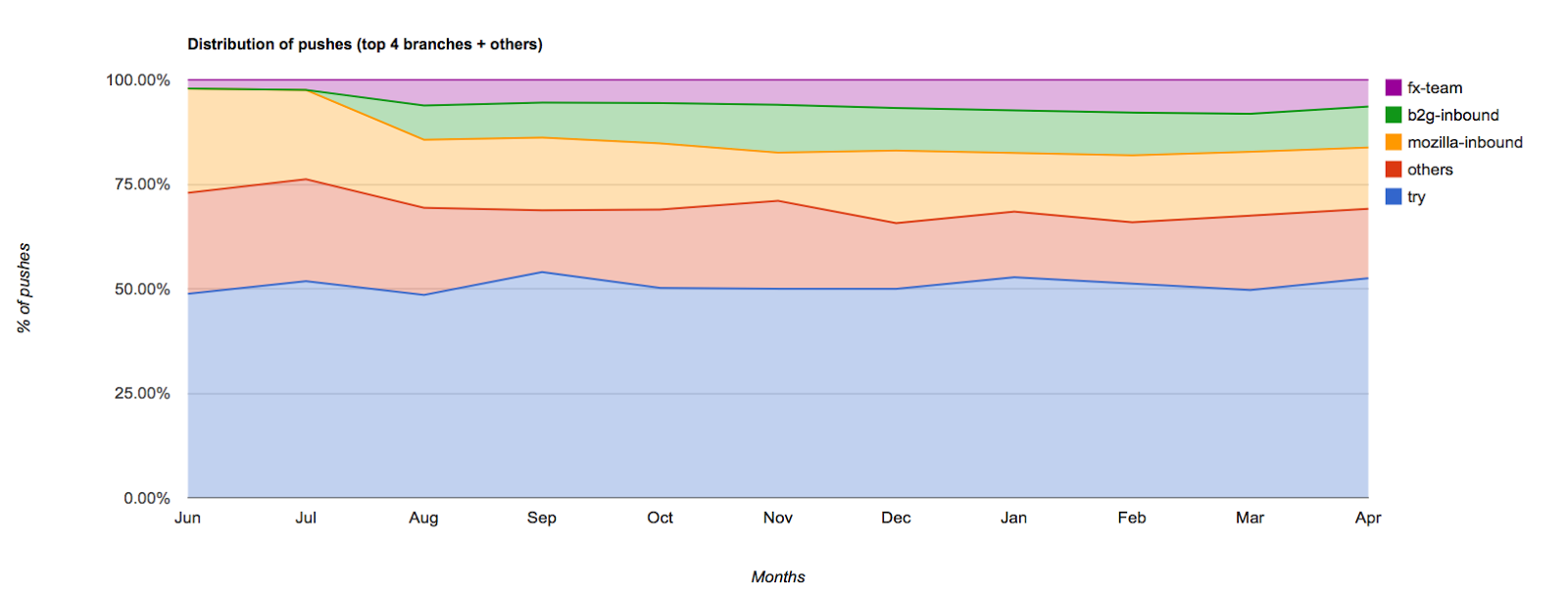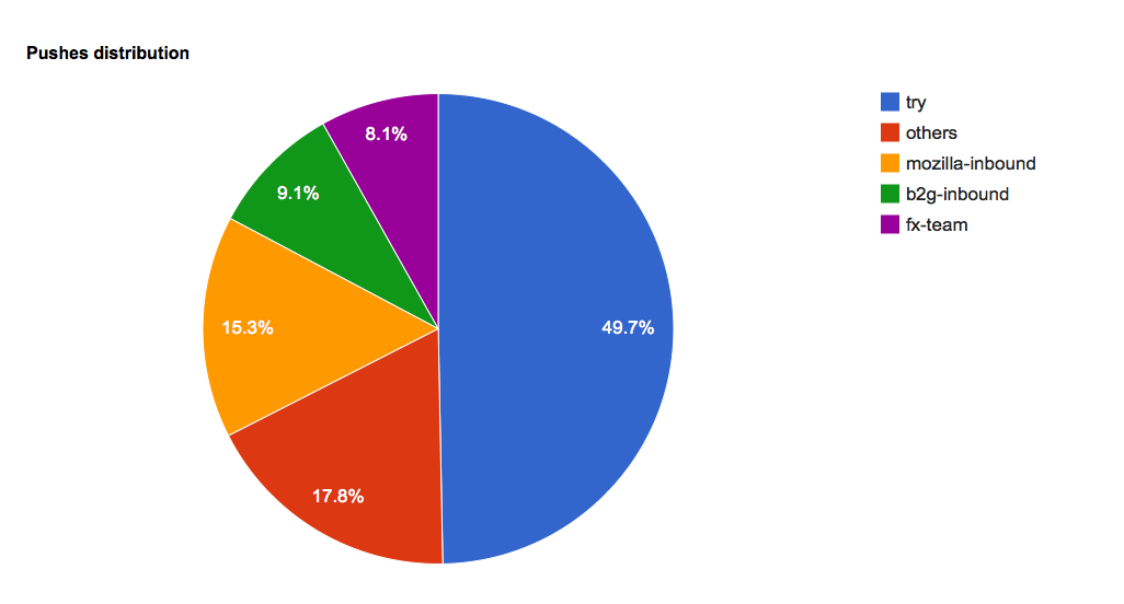 The three integration repositories (fx-team, mozilla-inbound and b2g-inbound) account for around 30% of all the pushes