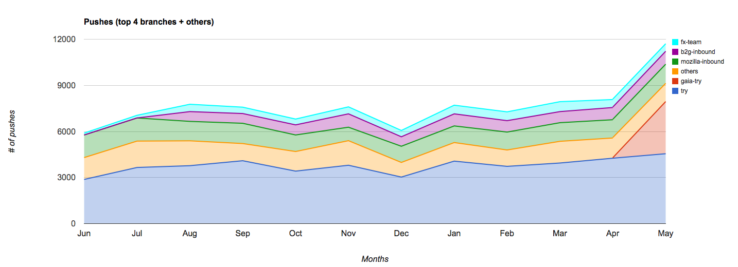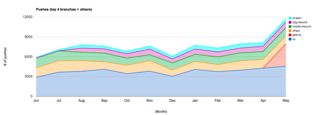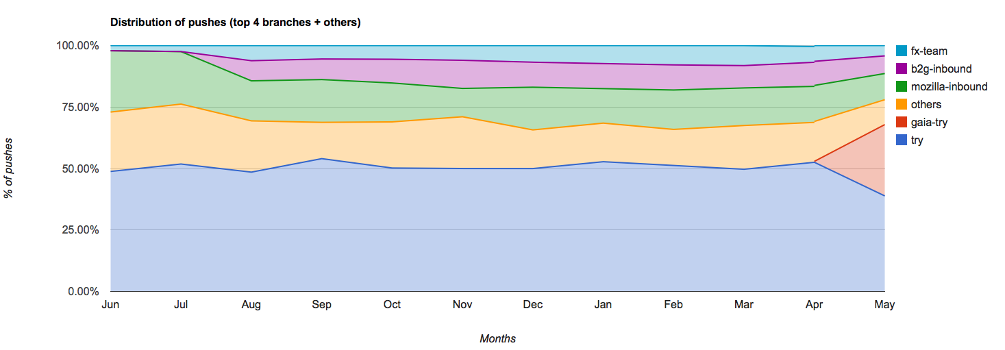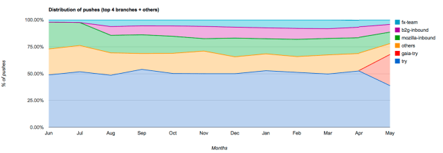 The introduction of Gaia-try in April has been very popular and comprised around 29% of pushes in May. The Try branch itself consisted of around 38% of pushes.