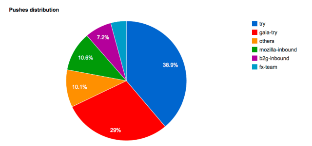 The three integration repositories (fx-team, mozilla-inbound and b2g-inbound) account around 22% of all the pushes, compared to 30% in the previous month.