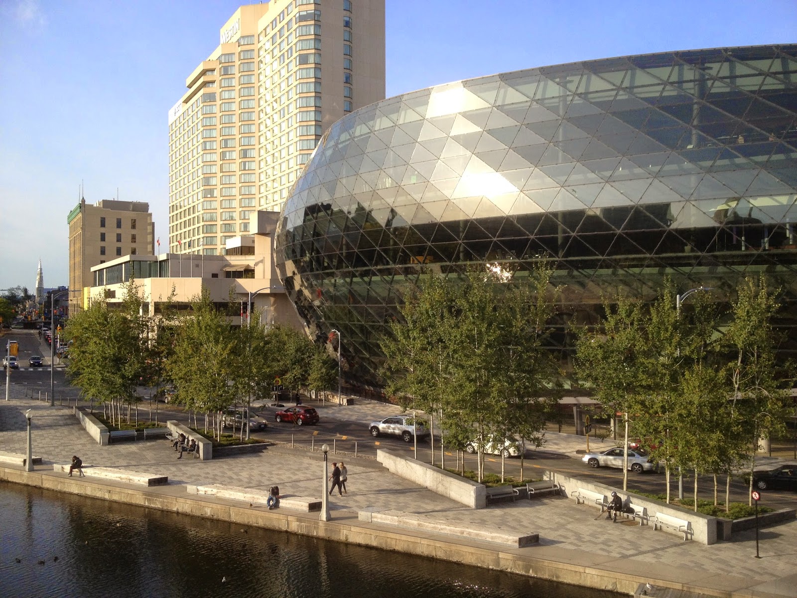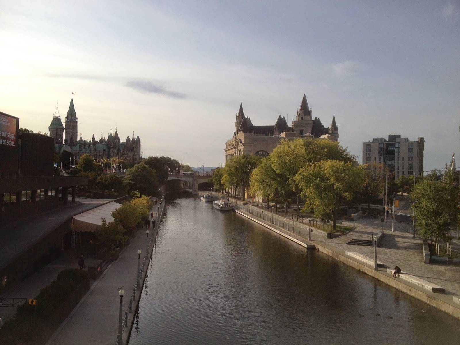 | View of the Parliament Buildings and Chateau Laurier from the MacKenzie street bridge over the Rideau Canal |