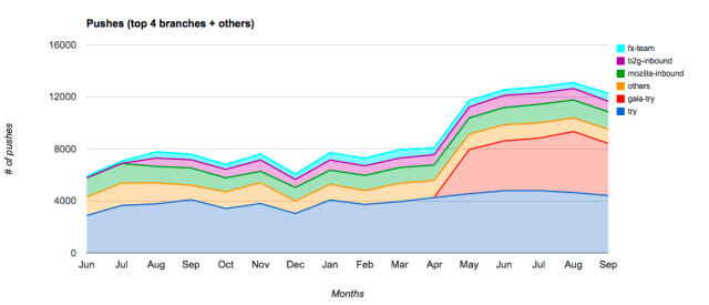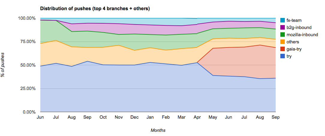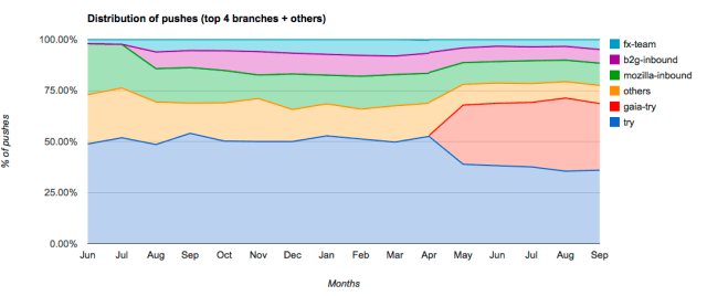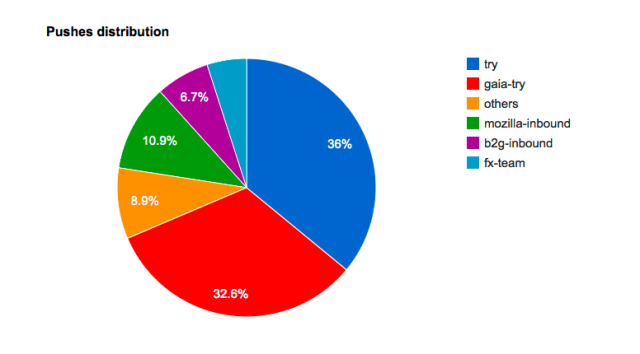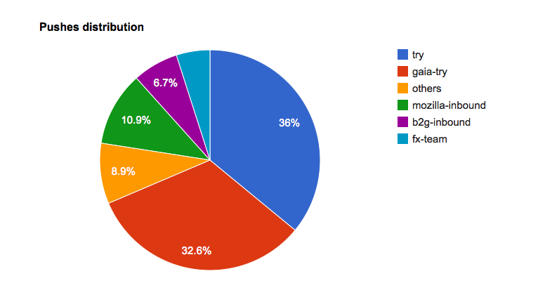 Try has around 36% of pushes and Gaia-Try comprise about 32%. The three integration repositories (fx-team, mozilla-inbound and b2g-inbound) account around 22% of all the pushes.