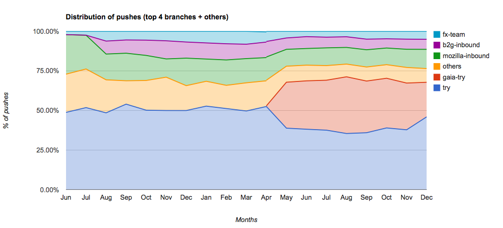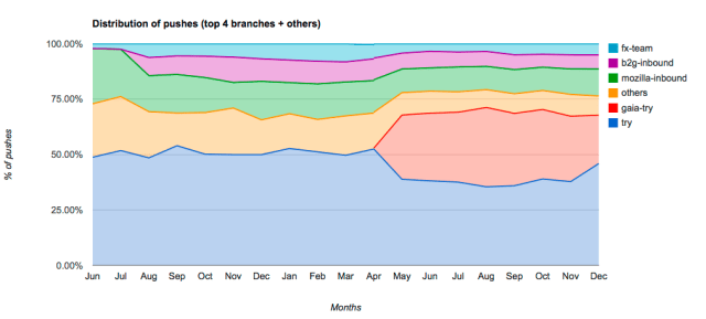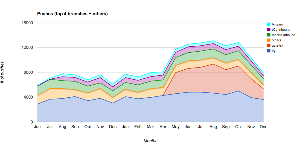 There was a low number of pushes this month.  I expect this is due to the Mozilla all-hands in Portland in early December where we were encouraged to meet up with other teams instead of coding 🙂 and the holidays at the end of the month for many countries.