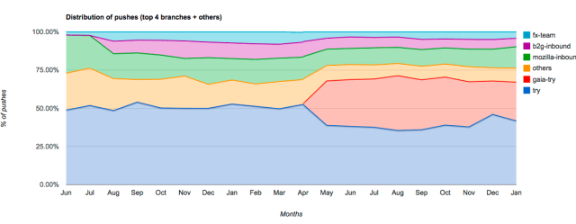 The three integration repositories (fx-team, mozilla-inbound and b2g-inbound) account around 24% of all of the pushes