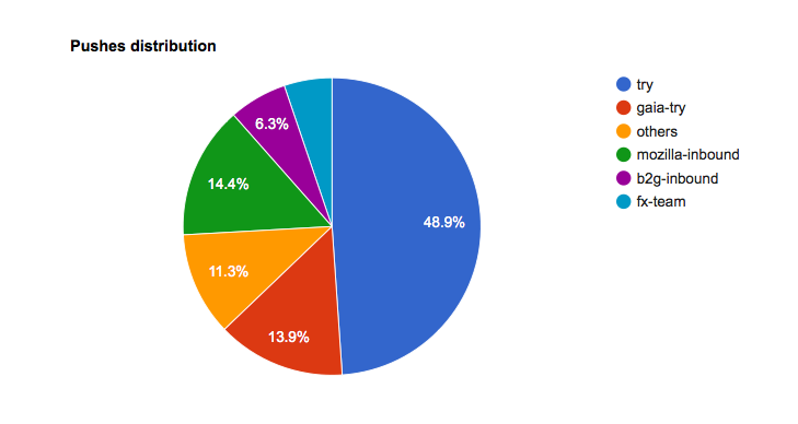 - The three integration repositories (fx-team, mozilla-inbound and b2g-inbound) account around 26% of all the pushes.