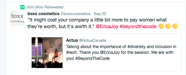 I really liked her discussion around hiring and referrals. She stated that when you’re hire people you already know you’re probably excluding equally or better qualified that you don’t know. By default, women of colour are underpaid.