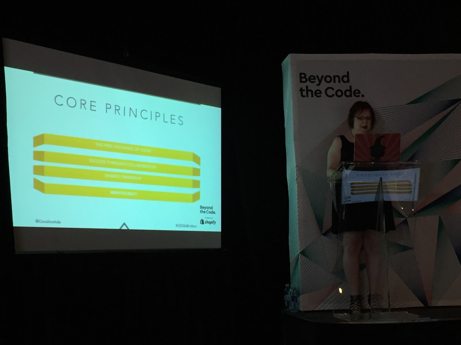 The next talk I attended was by Coraline Ada Ehmke, who is an application engineer at Github. Her talk was about the “Broken Promise of Open Source”. Open source has the core principals of the free exchange of ideas, success through collaboration, shared ownership and meritocracy.