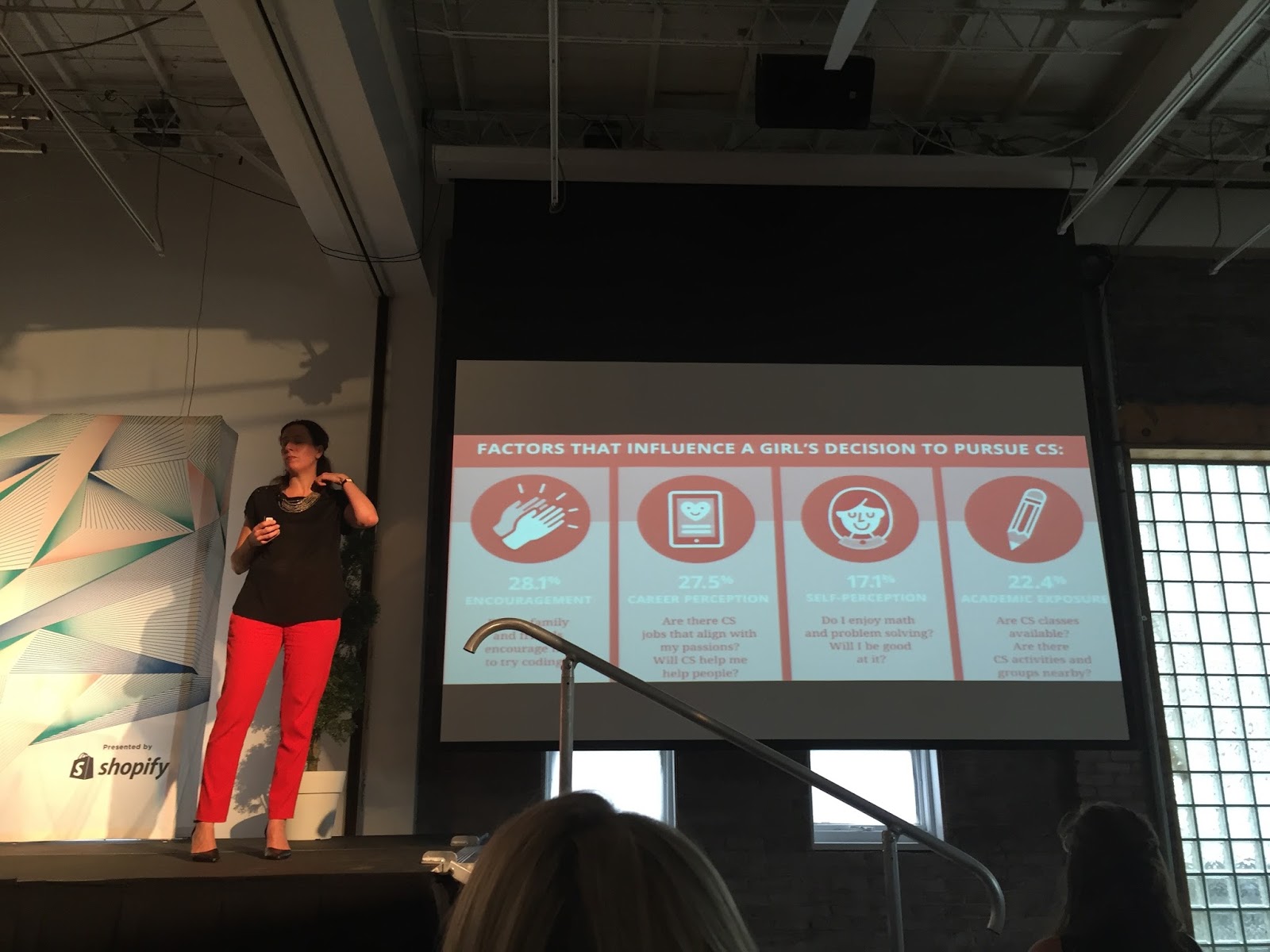 The last talk I attended was by Sabrina Geremia of Google Canada. She talked about the factors that encourage a girl to consider computer science (encouragement, career perception, self-perception and academic exposure.)