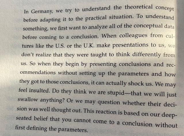 The Culture Map by Erin Meyer. Communication, defining goals and establishing trust vary by culture and these differences show up in the workplace. Understanding how to navigate these differences is crucial as a leader where teams and organizations span countries. For instance, people in some cultures may be quite hierarchical and defer to authority and thus be resistant to providing feedback to someone who is at a higher level. Other people who live in different cultures are quite confrontational and quick to challenge assumptions.