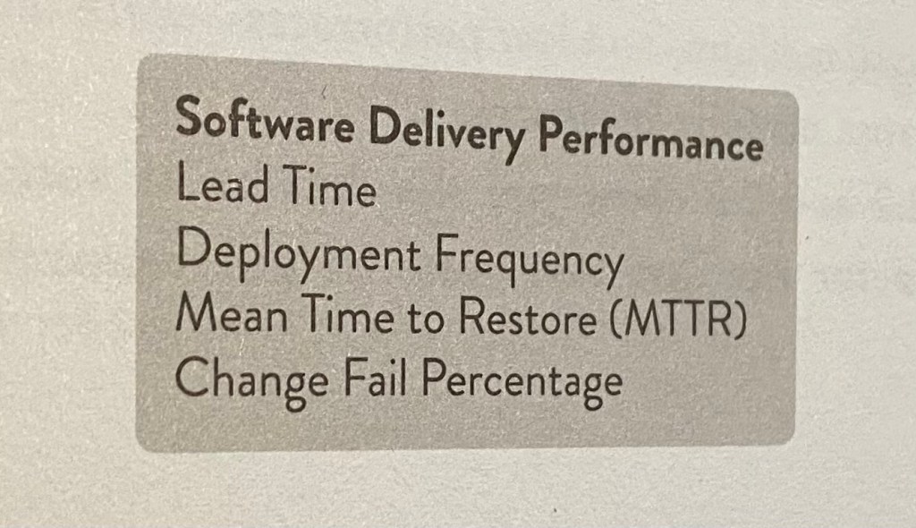 Accelerate by Nicole Forsgren Jez Humble Gene Kim (previous review) I refer to this book all the time. It is one of my all time favourite tech and business books. It describes in research based detail why it’s so important to focus on the following metrics for software delivery time and how that correlates with the performance of your business.